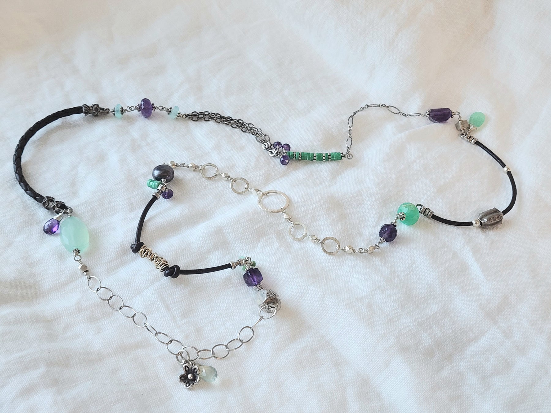 C'est la vie necklaces are designed to flow with your life style. There is no wrong way to wear this completely one of a kind necklace. This is the only one of its kind. Each gemstone and bead were selected for this singular piece.